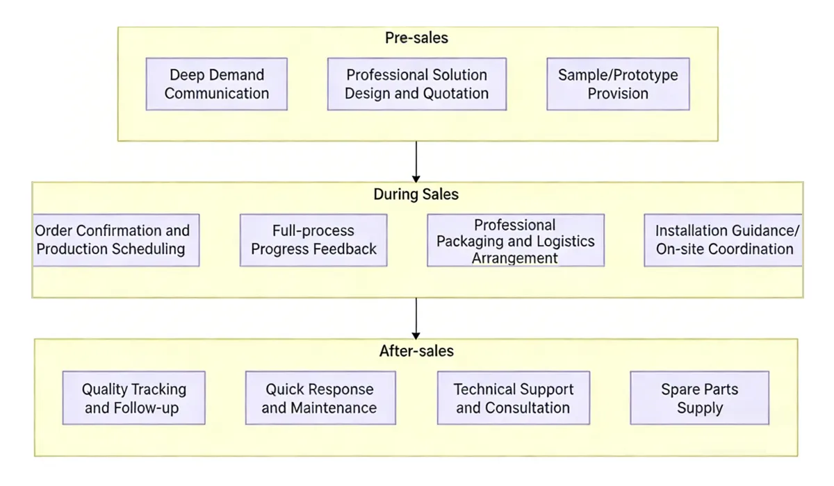 Po pristatymo „YeHaoXuan“ teikia visapusišką palaikymą po pardavimo, įskaitant reguliarius tolesnius veiksmus, skirtus stebėti gaminio būklę, greitą reagavimą ir gedimų taisymą, nuolatines technines konsultacijas ir pakankamai atsarginių dalių, kad būtų užtikrintas ilgalaikis stabilus naudojimas.